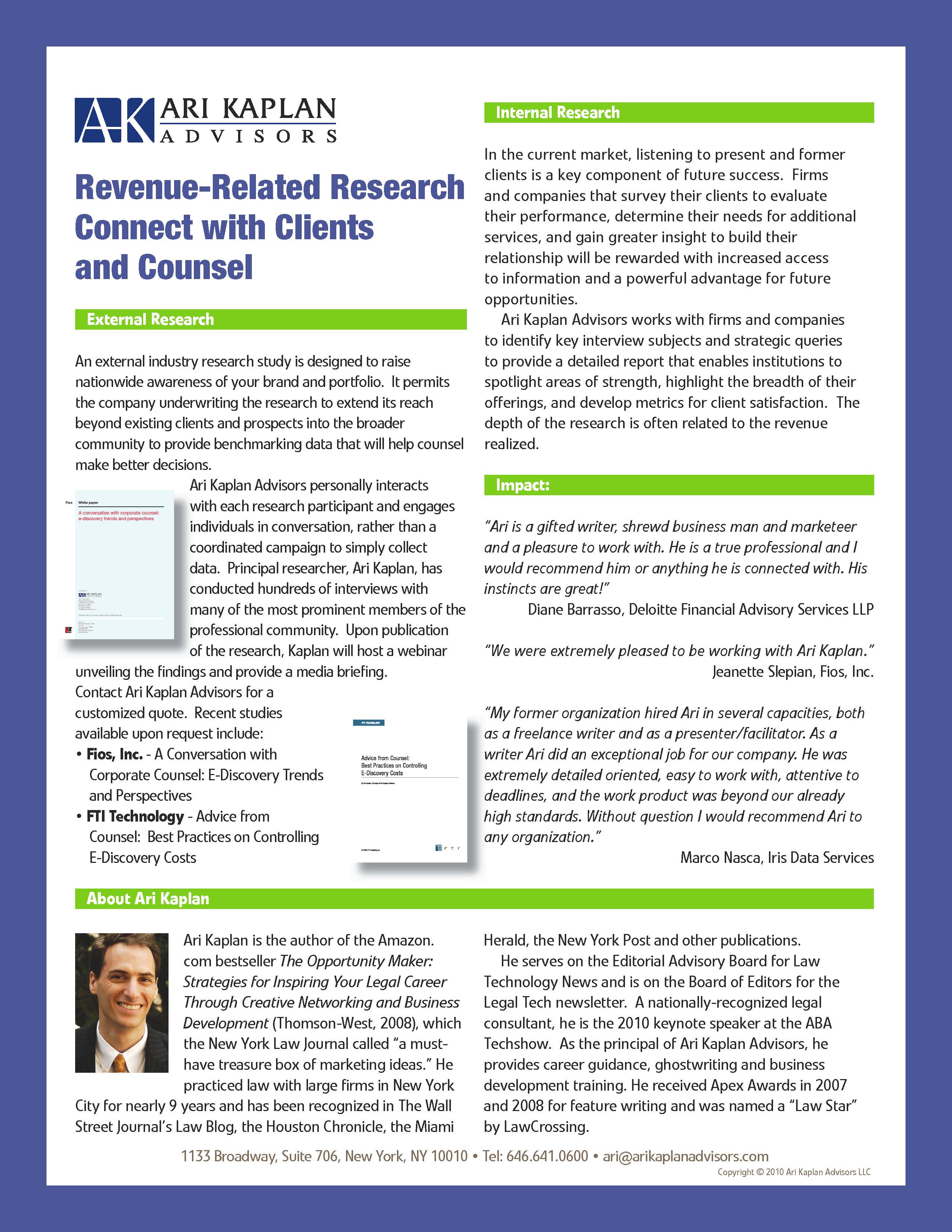 Ari Kaplan Advisors personally interacts with each research participant and engages individuals in conversation, rather than a coordinated campaign to simply collect data. Principal researcher, Ari Kaplan, author of the Amazon.com bestseller The Opportunity Maker: Strategies for Inspiring Your Legal Career Through Creative Networking and Business Development (Thomson-West, 2008), which the New York Law Journal called “a must-have treasure box of marketing ideas,” has conducted hundreds of interviews with many of the most prominent members of the professional community.
